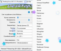 Добавить немного ощущение зимней магии с помощью DesktopSnowOK - небольшой утилиты, которая украшает рабочий стол падающими снежинками . Программа легко настраивается, не требует установки. Количество снежинок, которые одновременно появляются на экране можно менять. Минимально количество - 5, максимальное 64. Нужно отметить, что количество снежинок близкое к 30 создает приятное чувство легкого спокойного снегопада, но при этом совершенно не мешает работать. В настройках DesktopSnowOK вы также найдете прозрачность снежинок, и скорость их падения. Также доступно большое количество видов снежинок - шарики, звездочки, и даже текстуры в виде прозрачных футбольных мячей. Среди большого количества языков интерфейса есть и русский язык.